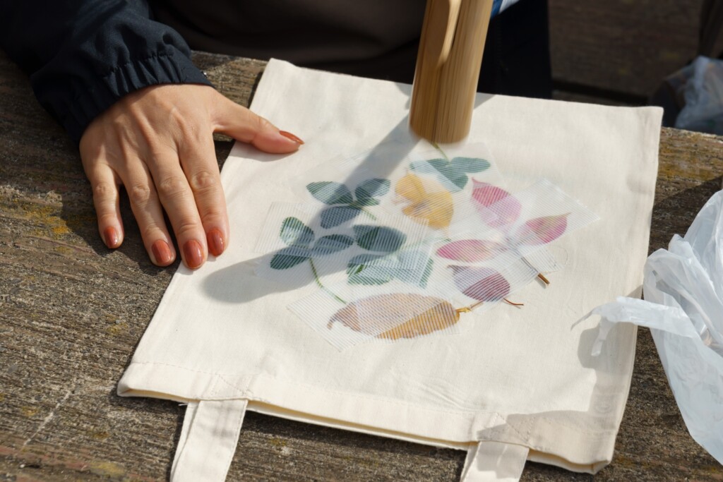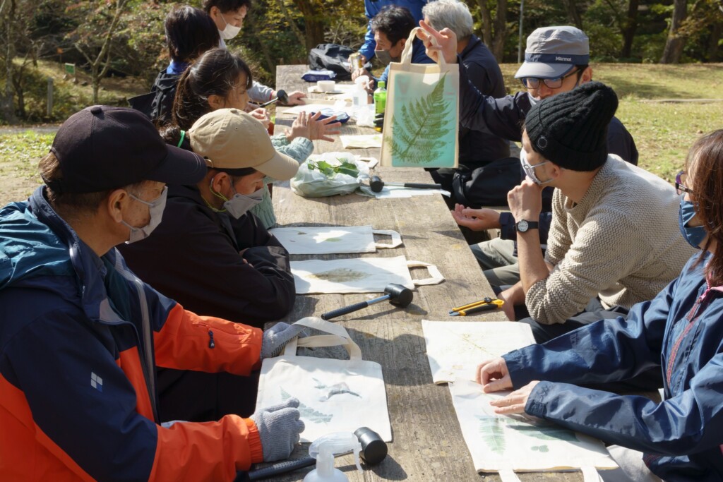 ハイキング後は、バスを更に北へと走らせ「リリーキャンプアカデミーセンター」にてBBQを行いました。さらに、「もりのびじゅつかん」のワークショップ班が主体となり、ハイキング中に集めた葉っぱを使用した「たたき染」でのオリジナルトートバック制作を行いました。植物の組み合わせや配置を工夫しながら、和気あいあいと取り組まれる姿が印象的でした。