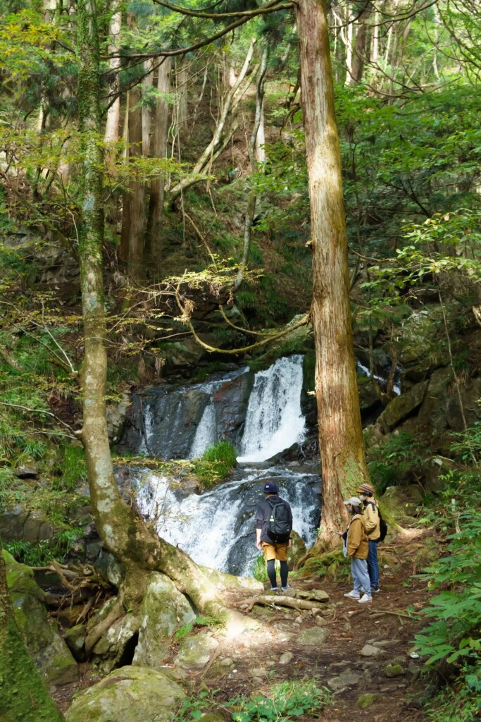 常陸太田里美地区の「塩の道ハイキングコース」へ到着後、ポットラックフィールド里美の岡崎さんに引率いただき、自然や地域の話を交えながら2.5kmのハイキングを満喫しました。川のせせらぎ、雄大な滝の音など里山の自然の奏でる音に囲まれながら、この後行われるワークショップで使う葉や木々を各々拾い集め、創作意欲も高めることができました。