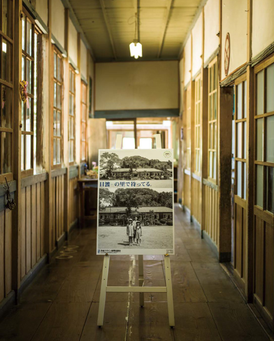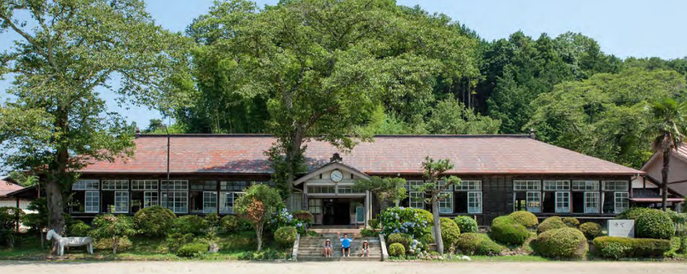 建築当時からみれば、校舎には人の手が加えられていますが、平屋造りの佇まいや、木のサッシにはめられた古い窓ガラスのおもむき、落書きや削り跡が残る木の机や椅子など、懐かしい小学校の風景がそのまま残されています。教室の窓の外には、いつの時代にも大子の山々が連なり、四季折々の姿を見せたことでしょう。その山の手前には、一日中お日様が照る、上岡の原風景、「日渡の田んぼ」が広がっています。