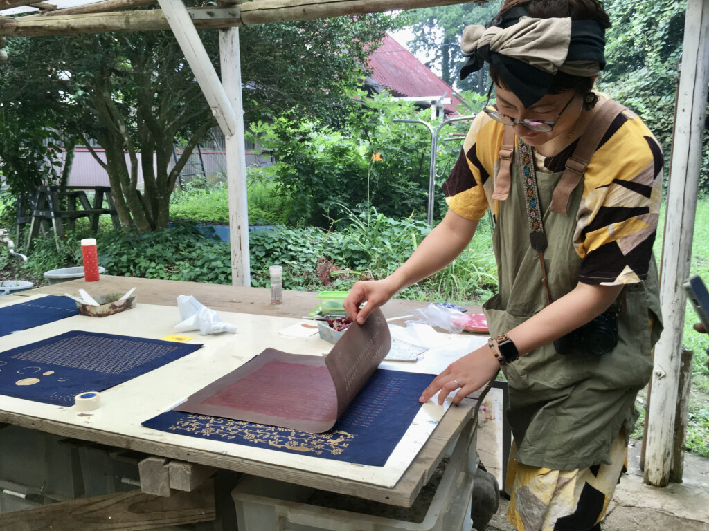 50年前に廃業したという、筑波山麓にあった染物屋さんで使用されていた藍染の型紙を使った「型染」体験をしました。型紙は3,000枚もの量があるそうで、その一部を拝見したのですが、昭和の時代のデザイナーの仕事が非常に興味深かったです。